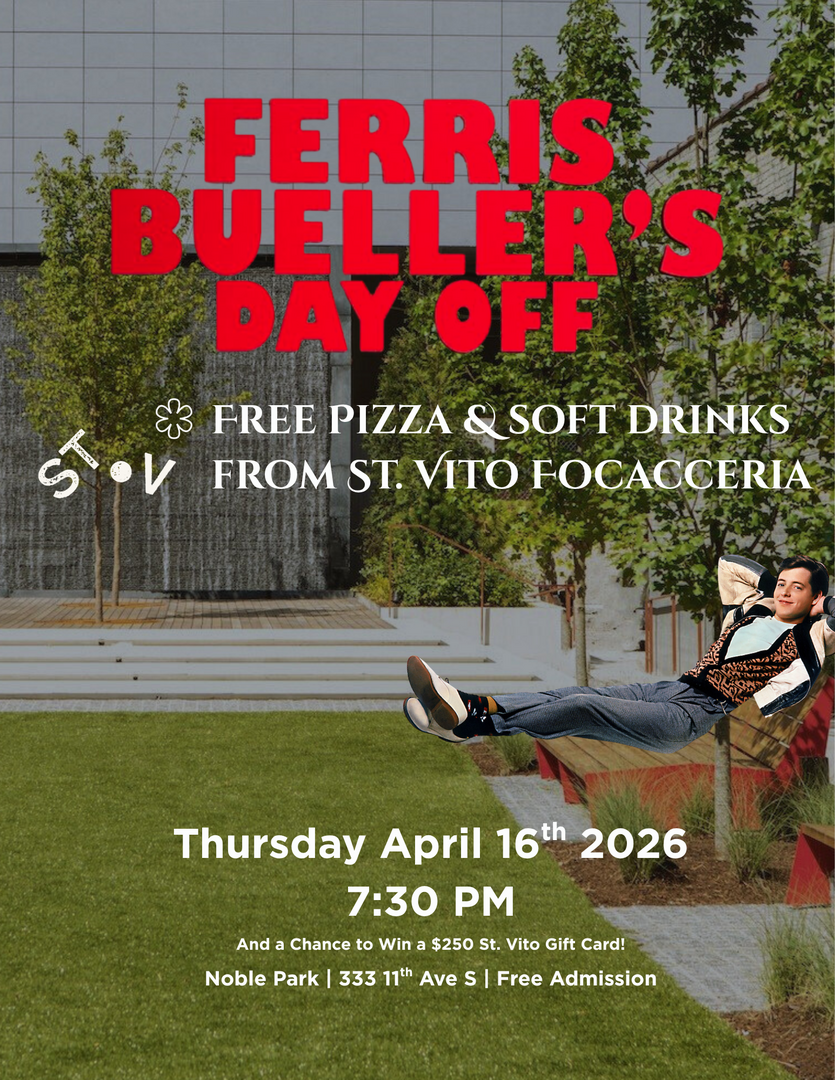 Movie Night is back in The Gulch! Head to Noble Park on Thursday, April 16, at 7:30 p.m. for a free screening of Ferris Bueller’s Day Off. St.Vito Focacceria will be set up, handing out free pizza and soft drinks while supplies last. Guests are encouraged to bring their own blankets, pillows, and chairs. Admission is free.