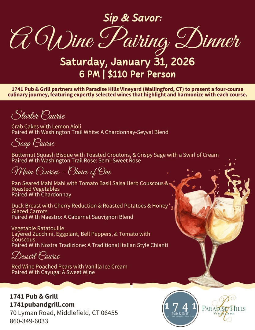 Join us for an unforgettable evening of fine food and wines as 1741 Pub & Grill partners with Paradise Hills Vineyard of Wallingford, CT for a thoughtfully curated wine pairing dinner on Saturday, January 31st at 6 PM. Guests will enjoy a four-course dining experience, with each course expertly paired to complement and enhance the flavors of the dish.