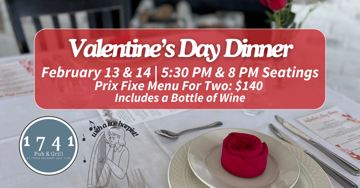 Sweep your Valentine off their feet with a romantic evening at 1741 Pub & Grill, complete with the elegant ambiance of a live harpist (Mae Cooke) performing throughout the evening! Enjoy an expertly crafted prix fixe dinner for two on Friday, February 13th, or Saturday, February 14th, with seating at 5:30 PM or 8 PM. Each reservation includes a bottle of red or white wine and a menu designed to delight all the senses.