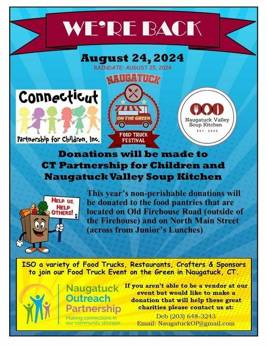 Naugatuck Outreach Partnership presents our 4th Annual Food Truck Festival on the Naugatuck Green. A day full of Food, Handcrafted Artisans and Entertainment for the whole family. Grab your lawn chair and come and relax on the Naugatuck Green DJ 11am-3pm, Lisa Minxx Band 4pm-7pm.