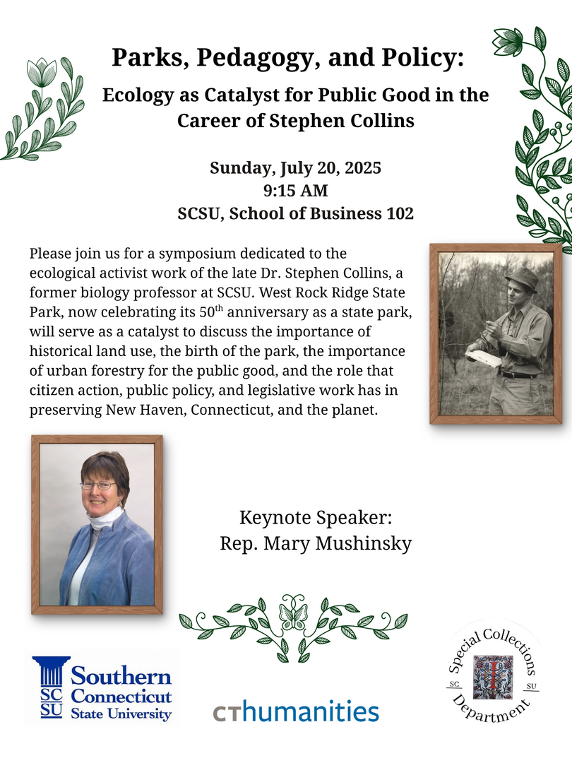 Dedicated to the work of the late Dr. Stephen Collins, a former biology professor at SCSU, the symposium will focus on West Rock Ridge State Park in New Haven and the importance of preserving the environment. Collins was a founding member of the West Rock Ridge Park Association, which successfully lobbied the General Assembly to pass legislation to create the park, which was unanimously approved. The symposium will highlight the significance of the intersection of Humanities and Science through the History of Science, Public Ecology, and Political Science. Generously funded by CTHumanities Grant.