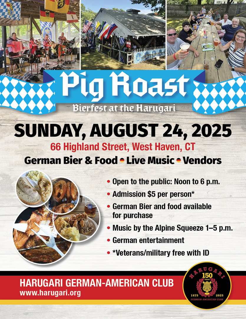 Join us for the Harugari Pig Roast & Bierfest on August 24—an afternoon of German fun, food and music! Gates open at noon, with food and beer available for purchase. The lively Alpine Squeeze band will perform from 1 to 5 p.m., plus additional entertainment and dancing throughout the day. Whether you're here for the music, the beer or just the good company, there's something for everyone!