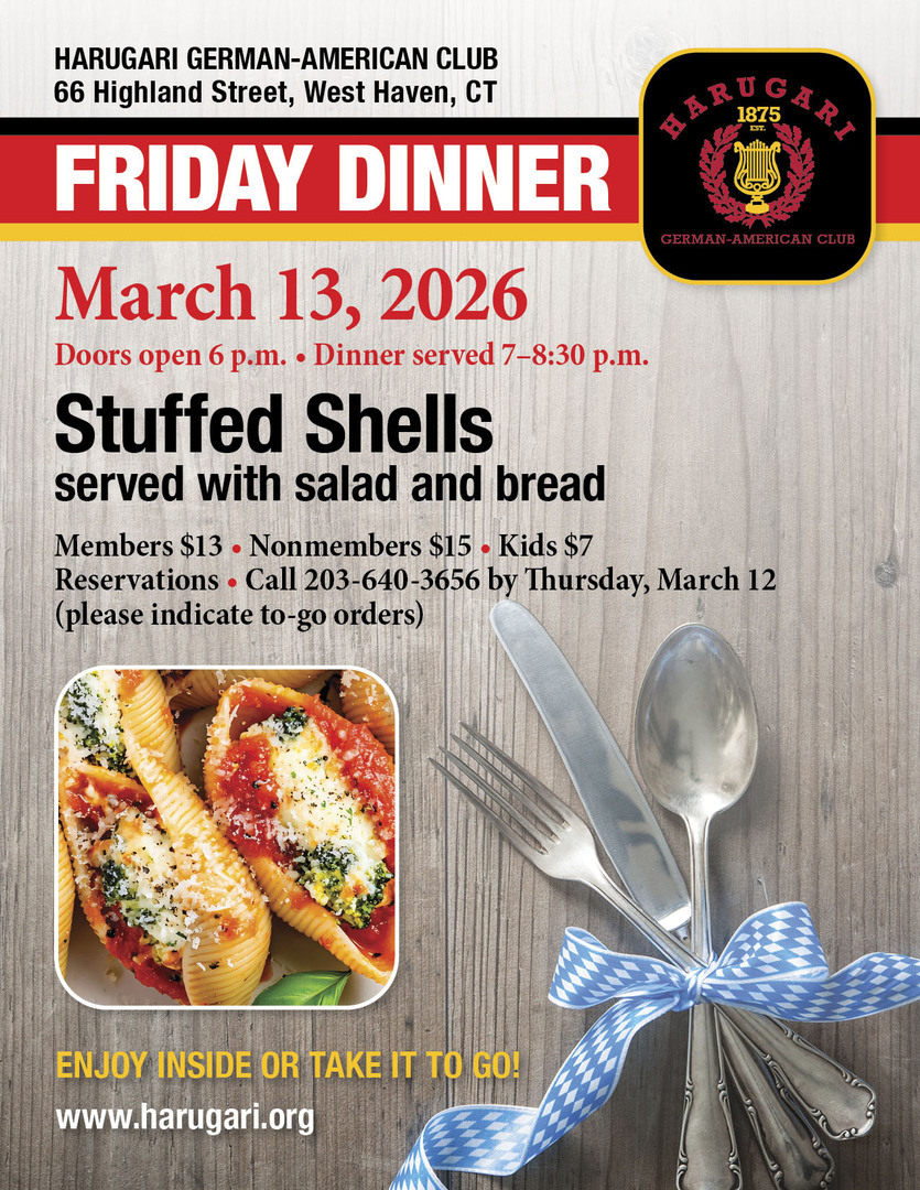 Join us for Stuffed Shells dinner served with salad and bread on Friday, March 13. Only $15 members, $18 nonmembers, $8 kids. Reserve by March 12 at 203-640-3656. Doors open 6 p.m. Please indicated to-go orders.