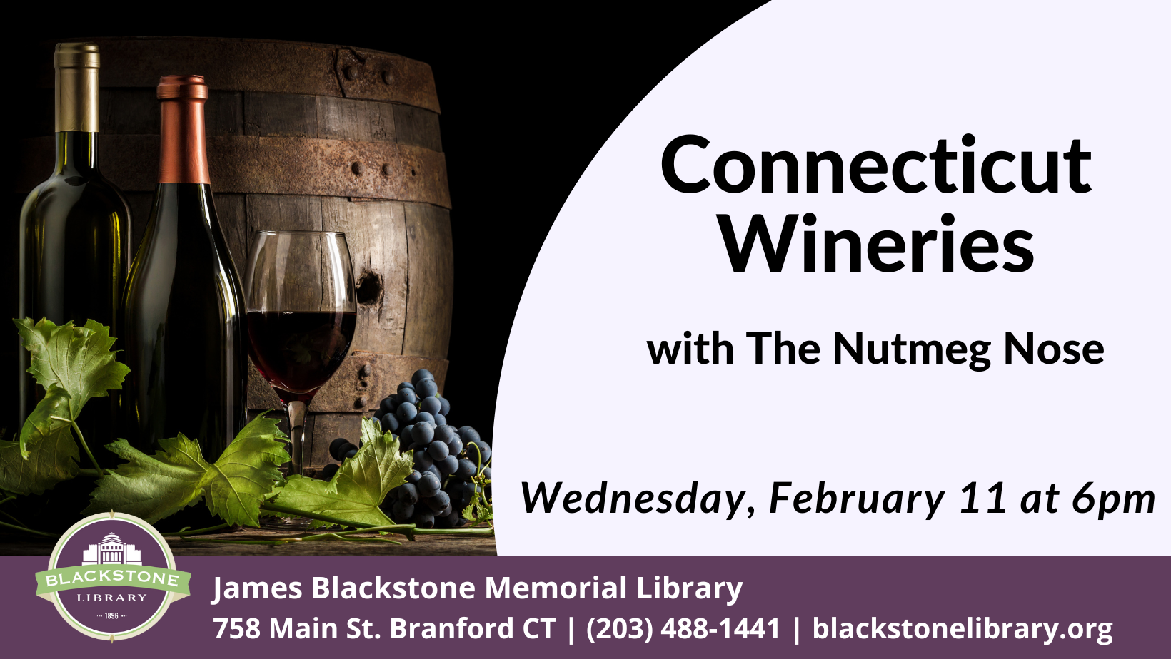 Take a ride through Connecticut’s wine country and learn about our state’s 40+ wineries with our wine guide, Michelle Griffis! Michelle will discuss the array of fantastic, award-winning wineries here in our state. Registration required. Sponsored by the Friends of Blackstone Library.