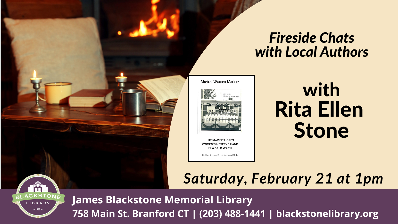 Join us for readings and discussions with local authors in front of the fireplace in our Reading Room! This week we will be joined by Rita Ellen Stone, author of Musical Women Marines – The Marine Corps Women’s Reserve Band in World War II.
