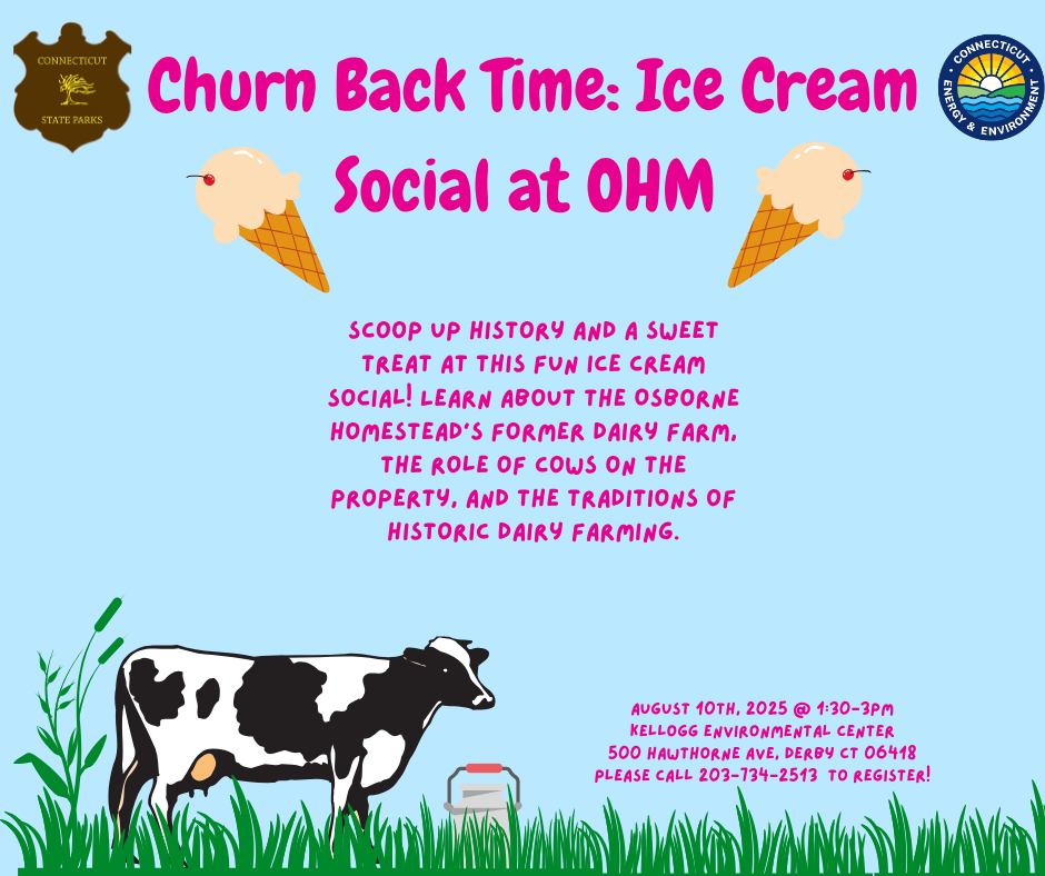 Free and open to the public! To register, please call (203) 734-2513 or email [email protected]. The Osborne Homestead Museum, a facility of the Department of Energy and Environmental Protection’s State Parks & Public Outreach Division, is open for free docent-led and self-guided tours on Thursdays and Fridays from 10:00 a.m. to 4:00 p.m., Saturdays from 10:00 a.m. to 4:00 p.m., and Sundays from 12:00 p.m. to 4:00 p.m. It is located at 500 Hawthorne Avenue off Rte. 34 in Derby, CT. The Kellogg Environmental Center, a facility of the Connecticut Department of Energy and Environmental Protection’s State Parks & Public Outreach Division, is open 9:00 AM to 4:30 PM, Tuesday through Saturday. It is located at 500 Hawthorne Avenue off Rte. 34 in Derby. For further information or directions please email [email protected] or phone the Kellogg Environmental Center at (203)734-2513.