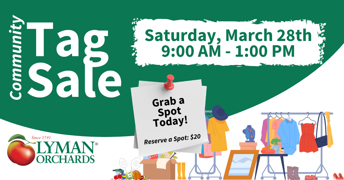 Looking to declutter your home and make some extra cash? Secure your spot to be a part of Lyman Orchards' Community Tag Sale! Clean out your closets, attics, and garages and bring your unwanted items to a tag sale extravaganza! You keep the profits! This is a perfect spot for people who don't have space to host their own tag sale.