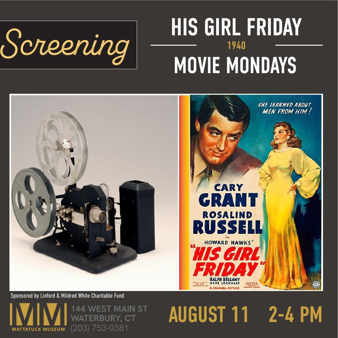 Sit back and relax during Movie Mondays at The MATT! His Girl Friday stars Cary Grant as a fast-talking newspaper editor tries to win back his star reporter and ex-wife (Rosalind Russell) in this whirlwind of wit and romance, where deadlines and love collide.