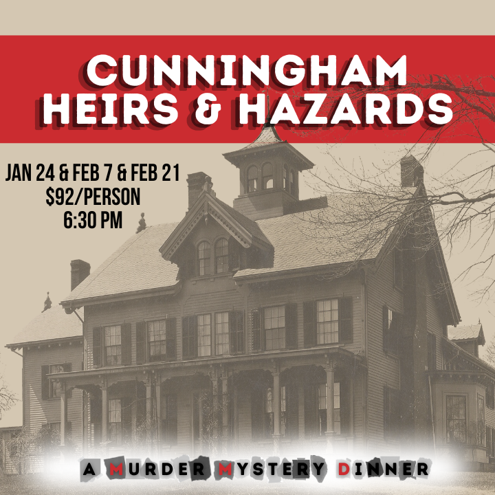 Step inside the storied halls of the historic Lyman Homestead and help unravel Cunningham Heirs & Hazards, a thrilling, interactive "whodunit" where every guest plays a role in cracking the case. Join us for an evening of dining, detective work, and deliciously dramatic twists.