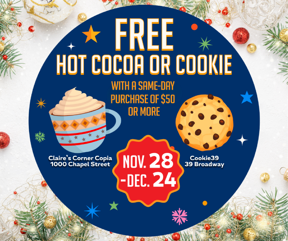 🛍️ Spend $50 or more at participating retailers and present your same-day paper or digital receipt to delight in one of these festive treats: • FREE Gourmet Hot Cocoa from Claire’s Corner Copia (1000 Chapel Street) ☕ • OR a FREE Cookie from Cookie39 (39 Broadway) 🍪