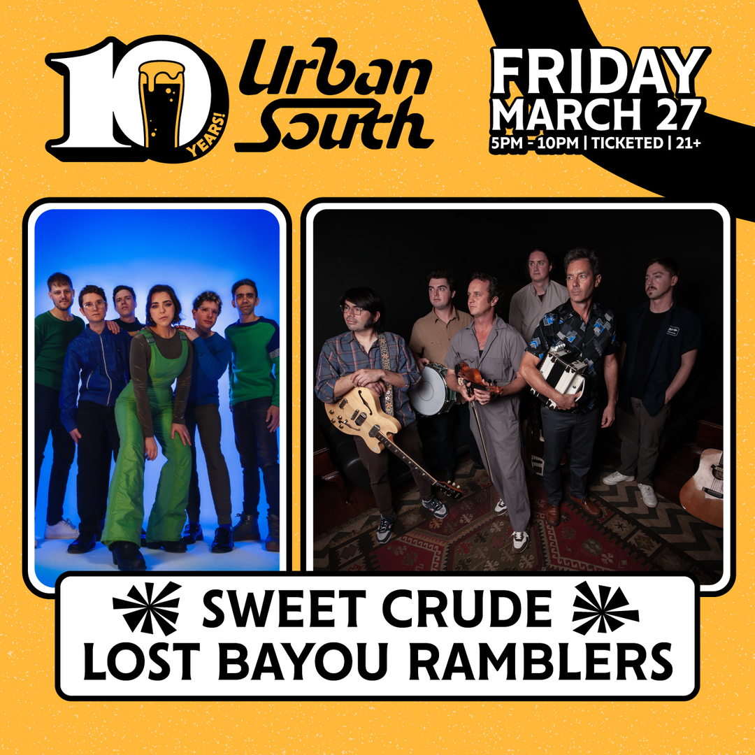 Urban South Brewery is kicking off its 10th Anniversary Party Weekend with an unforgettable Friday night concert on March 27 from 5 p.m. featuring Louisiana favorites Sweet Crude and Lost Bayou Ramblers.