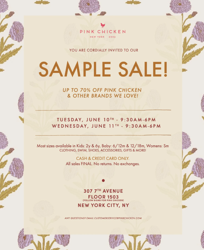 Join us for two days of little looks and big deals at the Pink Chicken Sample Sale! Shop our signature vintage-meets-boho styles for girls, boys, and baby-plus a selection of women's styles-at unbeatable prices. Discover charming prints, styles, and perfect pieces for sunny days ahead.