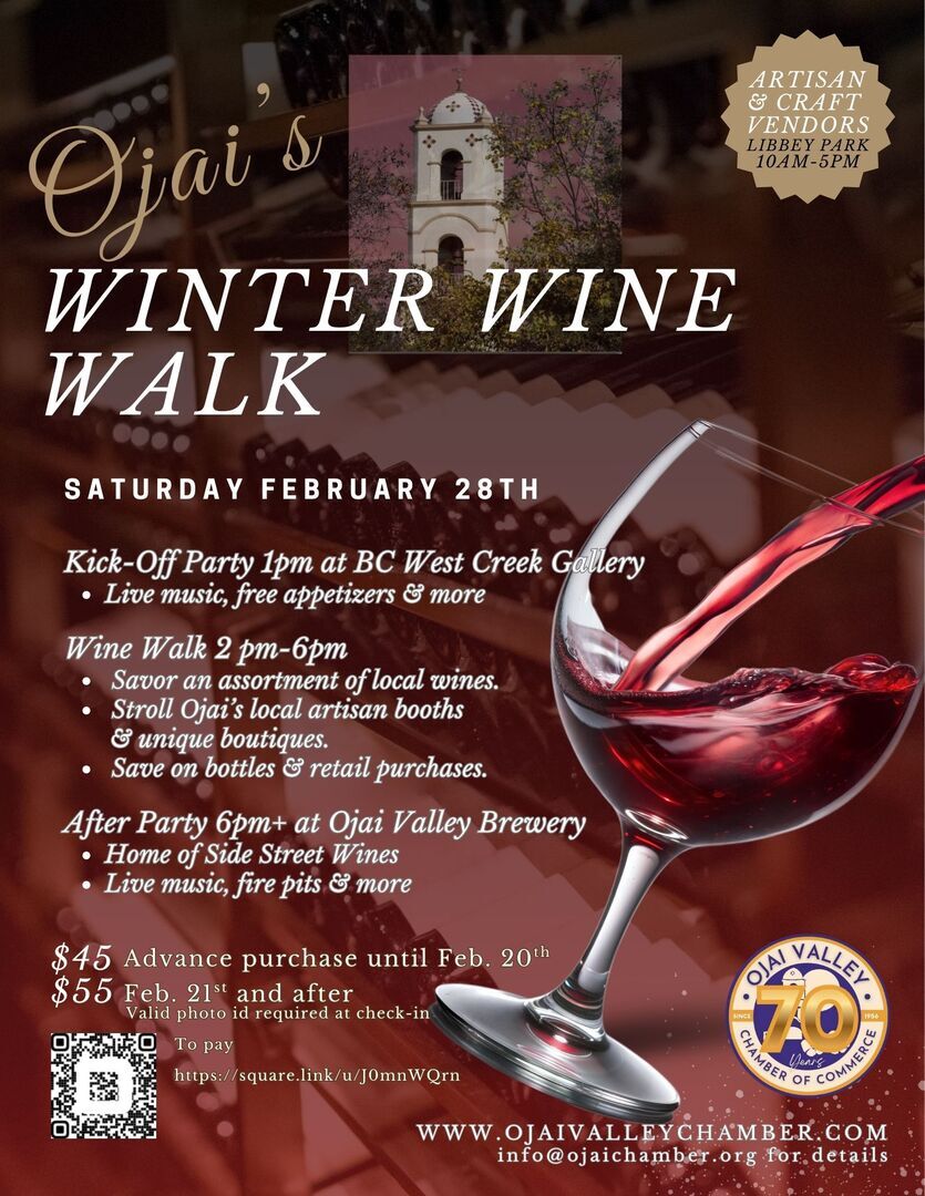 Ojai’s Winter Wine Walk offers wine lovers a unique tasting experience off the “beaten trail". Ticketholders can sample wines at local Ojai wineries that grow their own grapes, and also at downtown tasting rooms and boutiques.
