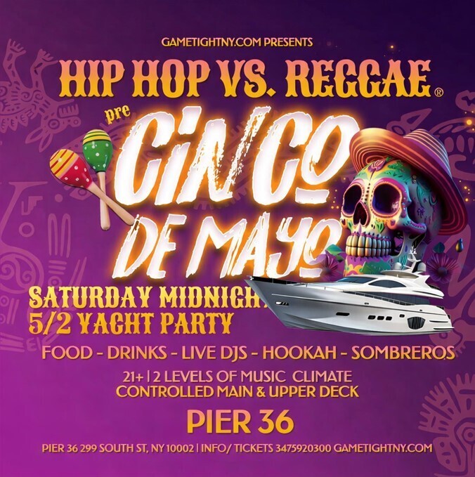 PRE CINCO DE MAYO NYC PARTY – HIP HOP VS REGGAE® SATURDAY MIDNIGHT YACHT PARTY CRUISE AT PIER 36 NYC