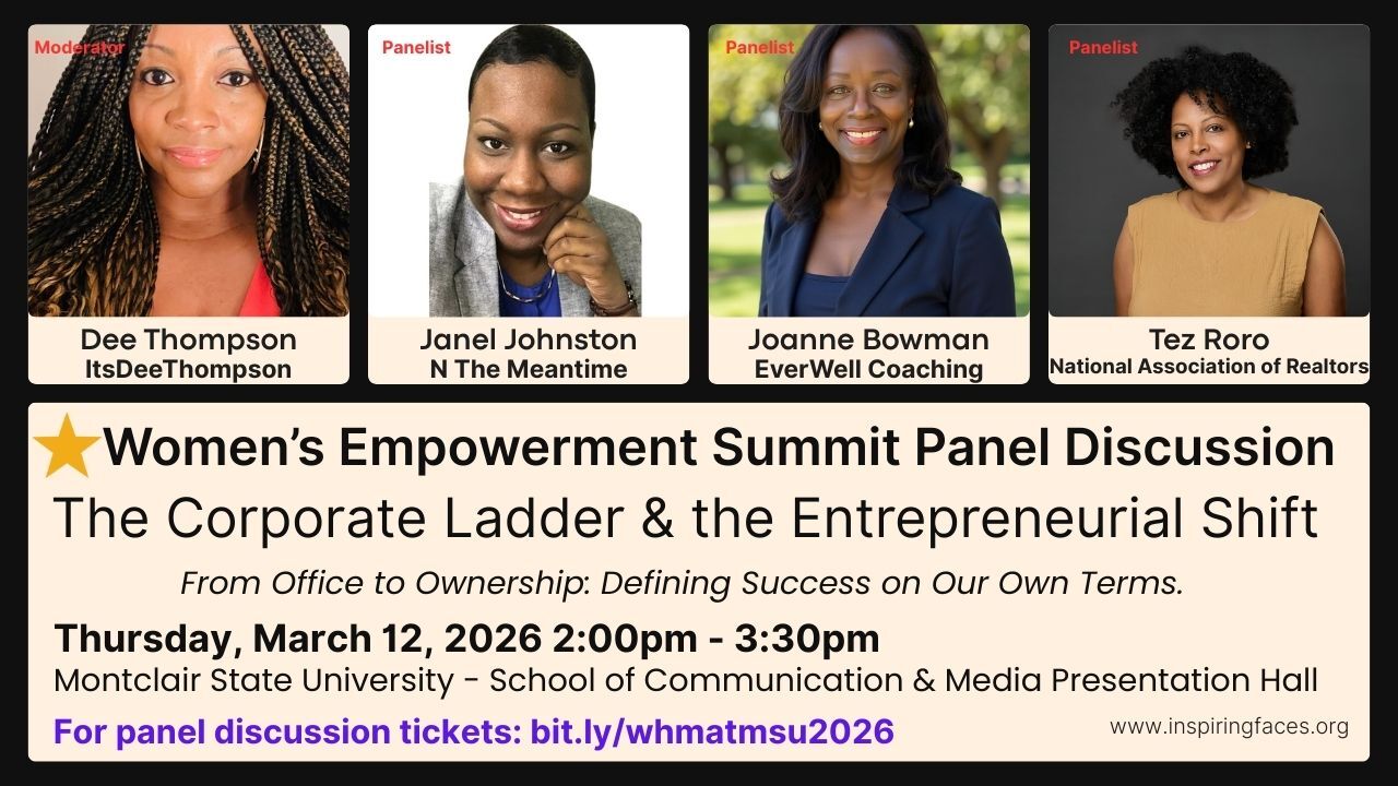 On Thursday, March 12, 2026, Inspiring FACES, Inc. will present the Women’s Empowerment Summit Panel Discussion, titled “The Corporate Ladder & the Entrepreneurial Shift,” at Montclair State University’s School of Communication and Media Presentation Hall.