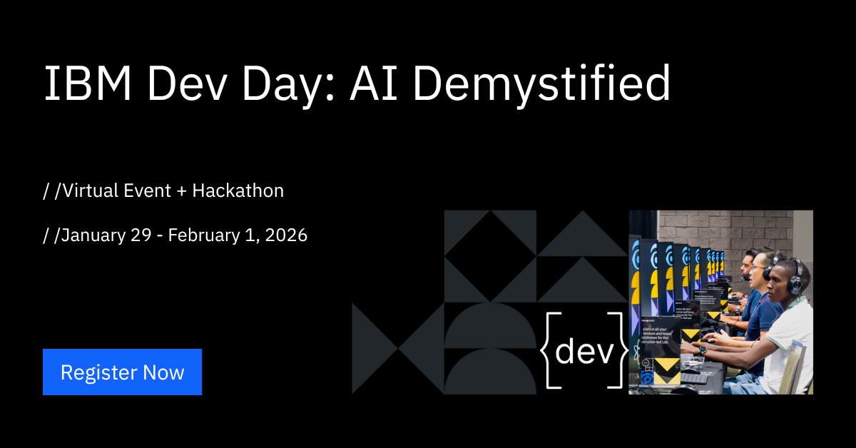 Kick off 2026 with IBM Dev Day: AI Demystified, a free, virtual event designed for developers, engineers, and AI builders on January 29th, 11:00AM - 5:00PM ET. Learn from IBM experts and open-source leaders about the latest AI tools, automation, and multi-agent workflows. Get hands-on with IBM Bob, ALTK, CUGA, IBM Granite, Langflow, and Mellea, and see how to build and scale AI smarter and faster.