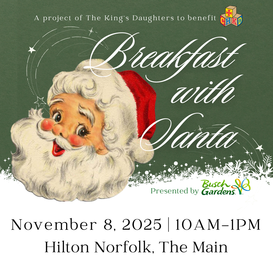 Join us for Breakfast with Santa presented by Busch Gardens Christmas Town on November 8, 2025 from 10am - 1pm at our NEW location - the Norfolk Hilton, The Main!