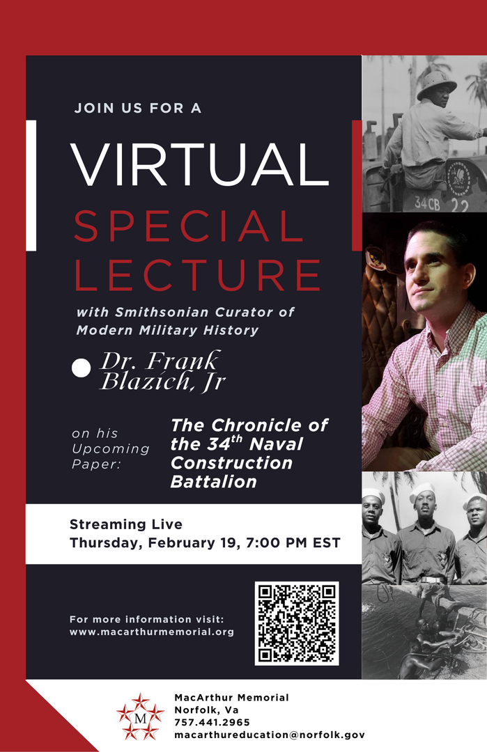On Thursday, February 19, 2026 at 7pm EST, the MacArthur Memorial will host Dr. Frank Blazich, Jr., Curator of Military History at the National Museum of American History, for a special virtual presentation. Dr. Blazich will present the history of the 34th Naval Construction Battalion. The 34th was the first African American “Seabees” Battalion in American naval history, which trained in the Norfolk area. This presentation will discuss their founding and their fight for racial equality during World War II.