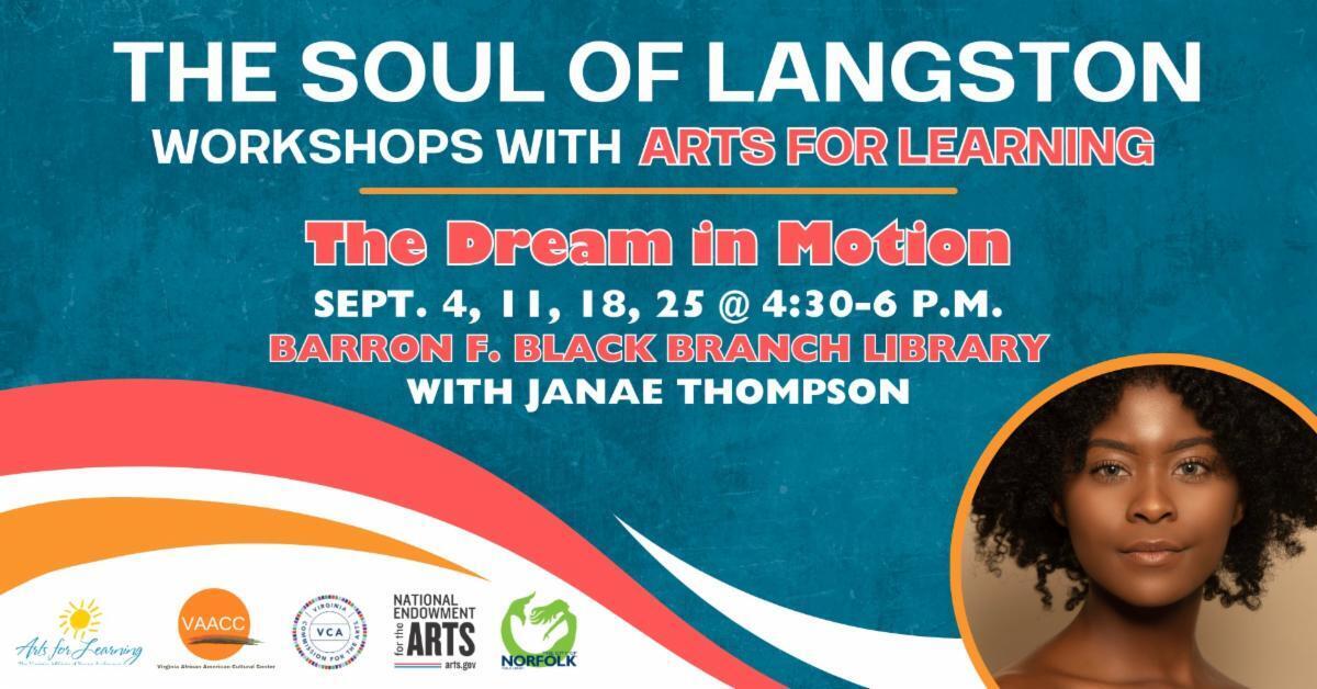 Arts for Learning Virginia’s Janae Thompson will use dance to lead participants in interactive workshops to explore poet Langston Hughes’s impact on literature, culture, and social justice. Each workshop will build on the previous one, with participants having the opportunity to share their creative work with the community in a final event.