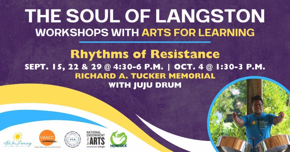 Arts for Learning Virginia’s Gary “Juju” Garlic will use drumming and poetry to lead participants in interactive workshops to explore poet Langston Hughes’s impact on literature, culture, and social justice. Each workshop will build on the previous one, with participants having the opportunity to share their creative work with the community in a final event.