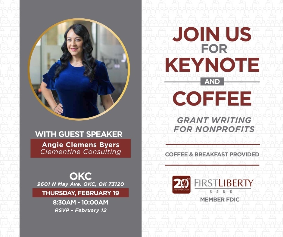 Keynote and Coffee at First Liberty Bank in OKC, a morning educational session focused on grant writing strategies for nonprofits, including practical insights and best practices. RSVP by Feb. 12.
