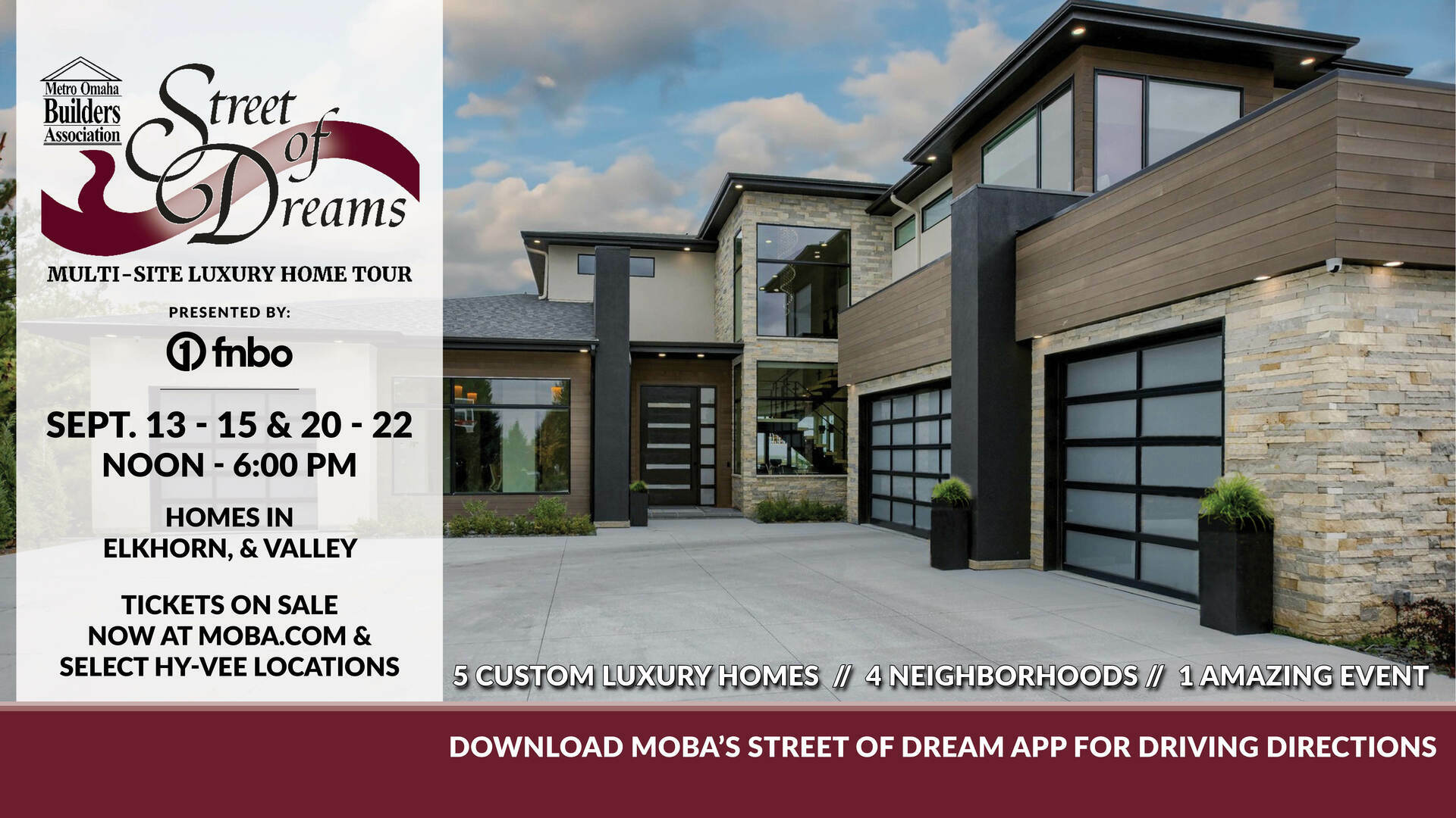 Get ready to step into luxury at MOBA's Street of Dreams Multi-Site Home Tour, presented by FNBO! Join us on September 13-15 and 20-22, from Noon to 6 PM. Tour a collection of five stunning, custom-built luxury homes across four distinctive neighborhoods, each showcasing unique designs priced from $1 million up to $3 million. Tickets are available now! Purchase online at www.MOBA.com or through the MOBA Street of Dreams mobile app and select Hy-Vee locations. For more event details, ticket pricing, and information about each home, visit www.MOBA.com.