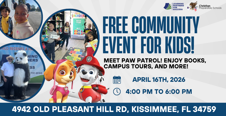 Fun for the whole family, FREE event!Bring the whole family for an afternoon full of fun, learning, and adventure!Free Community Day at Christian Preparatory School!Bring the whole family for an afternoon full of fun, learning, and adventure!Date: April 16th, 2026Time: 4:00 PM – 6:00 PMLocation: 4942 Old Pleasant Hill Rd, Kissimmee, FL 34759Event Highlights:Meet Chase and Skye LIVE!Say hello to our fire-fighting and high-flying pups!FREE Book GiveawayFrom the Learning Partners for Success Book Fair!Family Fun ActivitiesGames, crafts, and activities for all ages!School Tours AvailableMeet our amazing teachers and learn more about Christian Prep!Free Community EventInvite your family and friends for an evening of excitement and connection.We can’t wait to see you there!