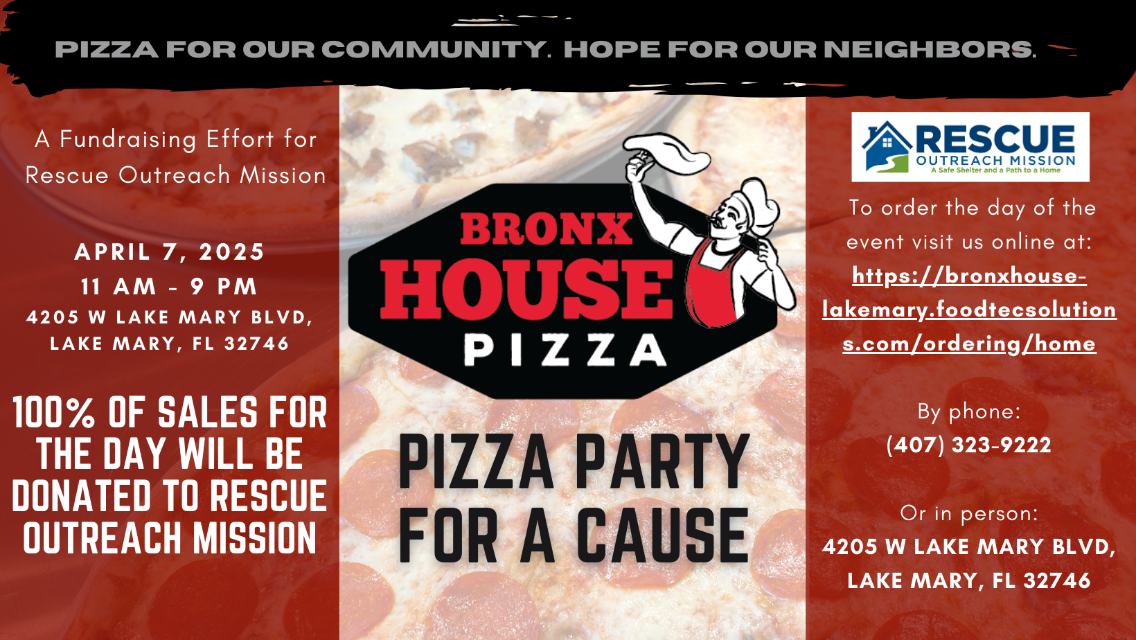 On Tuesday, April 7, Bronx House Pizza in Lake Mary will donate 100% of the day’s sales — not just a portion of proceeds — to Rescue Outreach Mission.