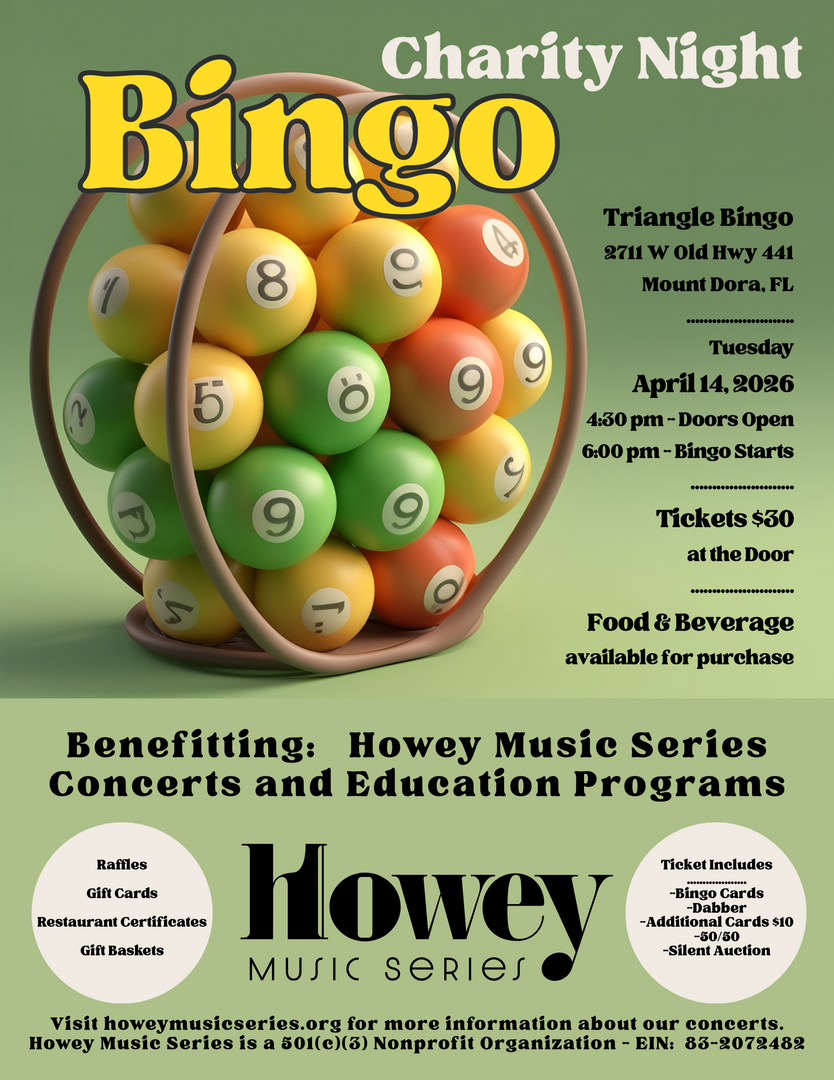 Join us for a fun night of bingo while supporting Howey Music Series concerts, arts education and community programming in Lake County! Bingo games & a raffle with fun experiences and items. Tickets at the door at $30.