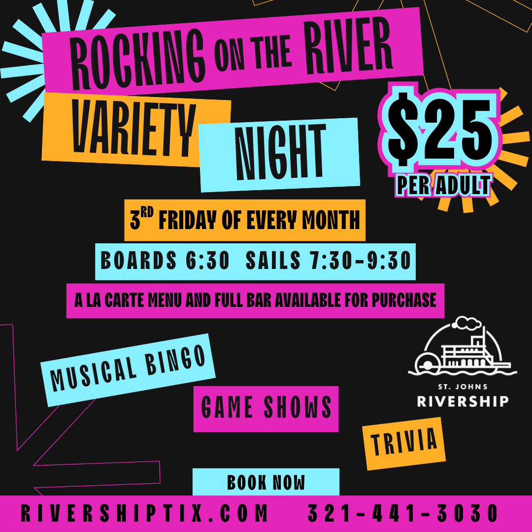 Join us for an exciting evening on the water as we set sail on Lake Monroe and the St. Johns River for a variety-packed night of entertainment! Play Musical Bingo and compete in thrilling game shows like Jeopardy, Family Feud, Trivia, and more, or hit the dance floor and dance your heart out in a lively, interactive atmosphere.