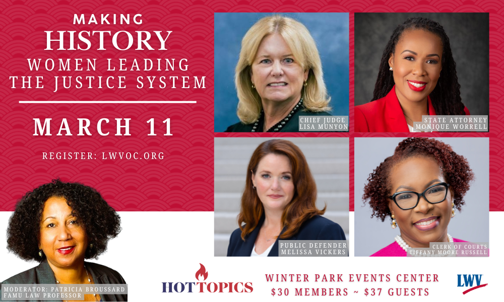 Four women have made history, becoming the first to head Orange County courts in all aspects. The League of Women Voters of Orange County hosts a March 11 Hot Topics panel discussion that will celebrate their achievements as part of Women’s History Month. Doors open at 10:30 a.m. at the Winter Park Events Center for a buffet lunch. The panel discussion, “Making History: Women Leading the Justice System,” starts at 11:45 a.m. at 1050 W. Morse Blvd. in Winter Park and ends at 1 p.m. Tickets are $30 for League members, $37 non-members. Register at www.LWVOC.org/HotTopics. The moderator is Patricia Broussard, a constitutional law professor at Florida A&M University College of Law. The panelists are the Hon. Lisa T. Munyon, chief judge of the Ninth Judicial Circuit Court; State Attorney Monique Worrell; Orange County Court Clerk Tiffany Moore Russell, and Public Defender Melissa Vickers.