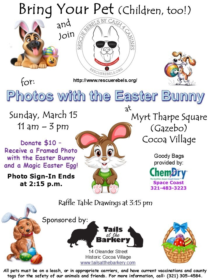 Bring your pet and children, too, and join Rescue Rebels by Cash 4 Canines, Inc., for Photos with the Easter Bunny in Historic Cocoa Village.