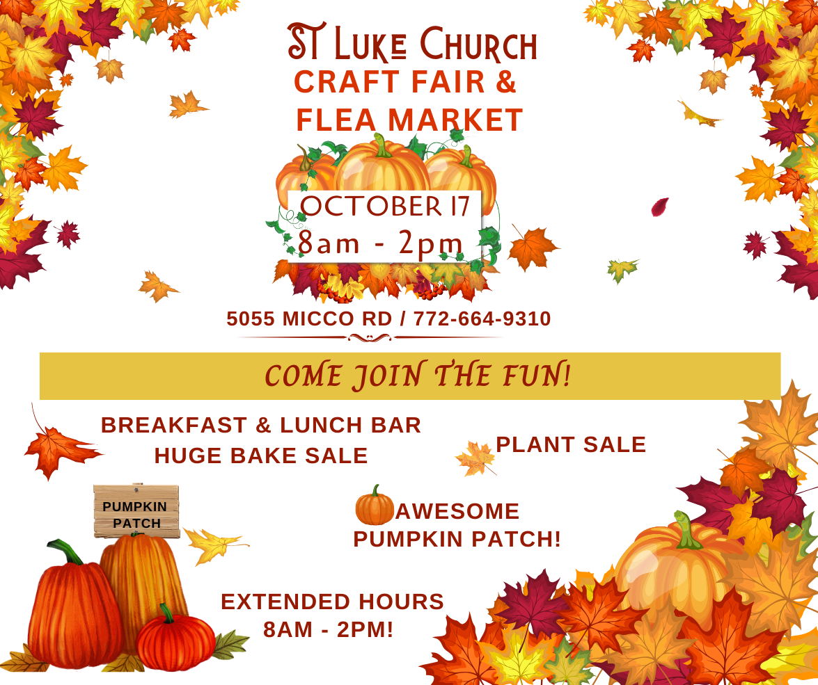 HomeEventsSt Luke Church Craft Fair/Flea Market. on Oct 17, 2026. Located at 5055 Micco Road, Micco Florida. St Luke Church Craft Fair/Flea Market. on Oct 17, 2026. Located at 5055 Micco Road, Micco Florida. Saturday, October 17, 2026 8:00 AM - 2:00 PM 8:00 AM - 2:00 PM See all dates and Times St Luke's Catholic Church Parking Deals Get a Ride LYFT UBER Add to Calendar 10/17/2026 08:00 AM 10/17/2026 02:00 PM America/Anguilla St Luke Church Craft Fair/Flea Market. on Oct 17, 2026. Located at 5055 Micco Road, Micco Florida. We are always looking for vendors. Spaces available both inside and outside. Please call 772-664-9310 for more information. Details & Tickets: https://www.upcomingevents.com/palm-bay/events/st-lukes-catholic-church/st-luke-church-craft-fairflea-market-on-oct-17-2026-located-at-5055-micco-road-micco-florida-637034?ref=uceaddevent St Luke's Catholic Church, 5055 Micco Road, Micco, FL, 32976 Set Reminder Categories Craft Beer, Food, Wine, Drink Specials, Good For Families, Kid-Friendly, Kids & Family, Neighborhood, Sales & Retail, Shopping We are always looking for vendors. Spaces available both inside and outside. Please call 772-664-9310 for more information.