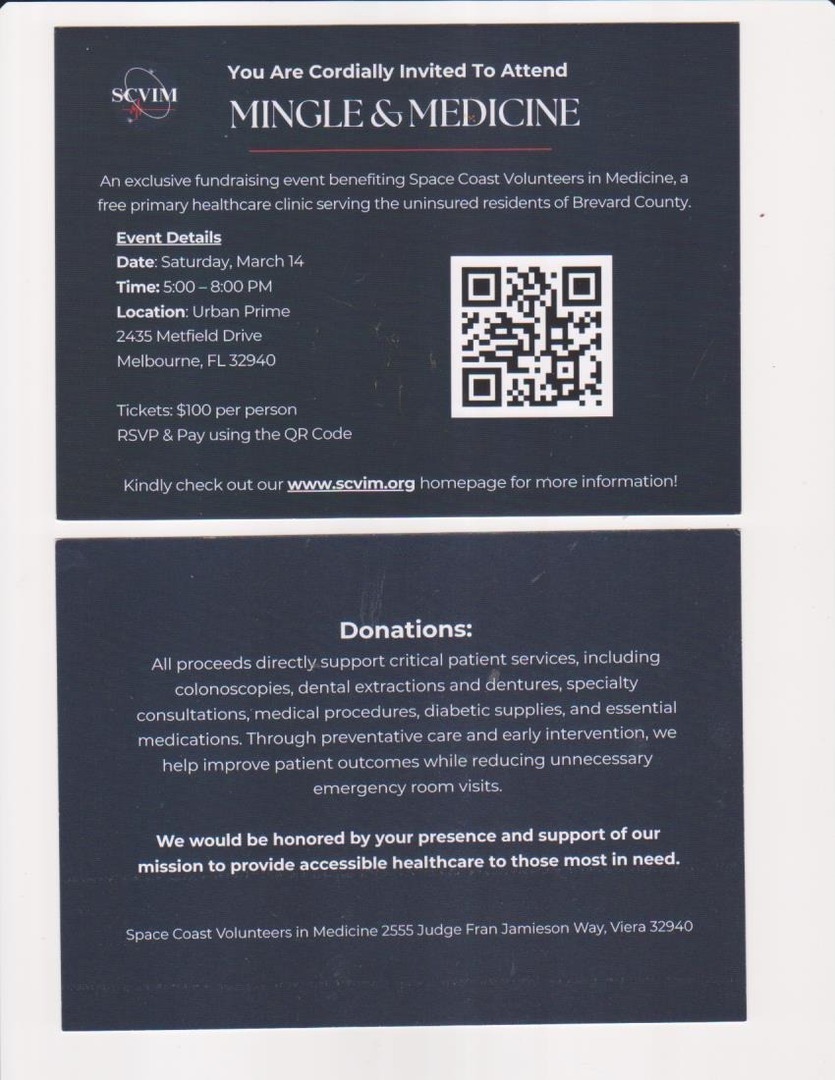 HomeEventsMingle & Medicine Mingle & Medicine Saturday, March 14, 2026 5:00 PM - 8:00 PM 5:00 PM - 8:00 PM See all dates and Times Urban Prime Marketplace & Restaurant Parking Deals Get a Ride LYFT UBER Add to Calendar 03/14/2026 05:00 PM 03/14/2026 08:00 PM America/Atikokan Mingle & Medicine Tickets are $100 per person; RSVP & Pay using the QR code.Event LinksTickets: https://go.evvnt.com/3478172-0 Details & Tickets: https://www.upcomingevents.com/palm-bay/events/urban-prime-marketplace-restaurant/mingle-medicine-600927?ref=uceaddevent Urban Prime Marketplace & Restaurant, 2435 Metfield Drive, Melbourne, FL, 32940 Set Reminder Categories Benefits Charity, Charities, Fundraising & Charity, Volunteering Neighborhoods Angel City (Merritt Island)South Patrick Shores (Satellite Beach)Alafaya (Orlando)City of Orlando-GOAA (Orlando) Tickets are $100 per person; RSVP & Pay using the QR code.Event LinksTickets: https://go.evvnt.com/3478172-0