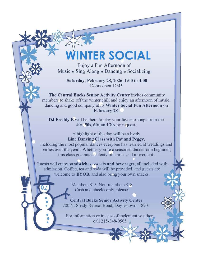 The Central Bucks Senior Activity Center invites community members to shake off the winter chill and enjoy an afternoon of music, dancing and good company at its Winter Social Fun Afternoon on February 28.from 1:00 - 4:00PM.