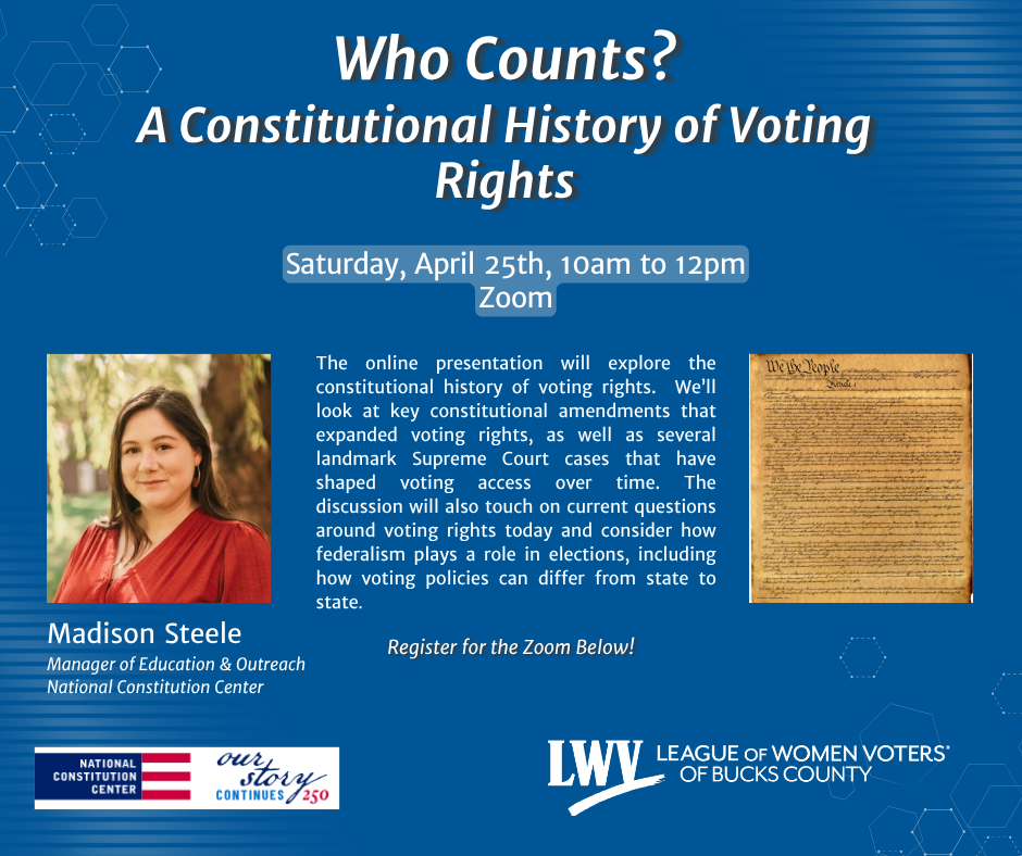 Madison Steele from the National Constitution Center, will explore the constitutional history of voting rights beginning with voting practices in colonial America, moving through the Constitutional Convention, and then tracing the story through our nation’s constitutional history. The presentation will cover key constitutional amendments that expanded voting rights, as well as several landmark Supreme Court cases that have shaped voting access over time. The discussion will also touch on current questions around voting rights today and consider how federalism plays a role in elections, including how voting policies can differ from state to state.