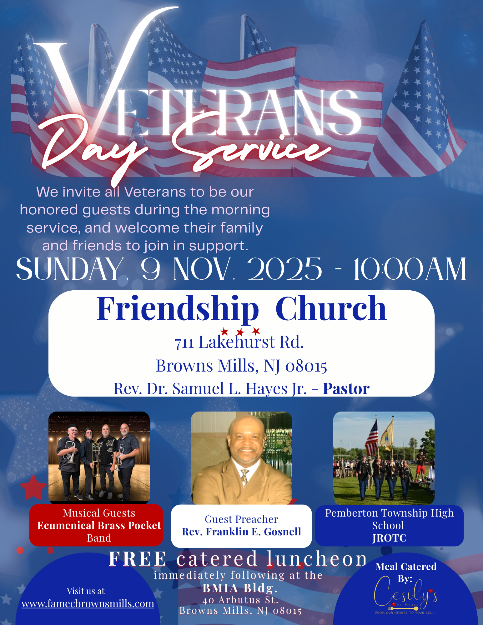 HomeEventsVeterans Day Service "Wounded But Worthy" This Event has Passed Veterans Day Service "Wounded But Worthy" Sunday, November 09, 2025 10:00 AM - 3:00 PM 10:00 AM - 3:00 PM See all dates and Times Friendship AME Church Parking Deals Get a Ride LYFT UBER Facebook Event Add to Calendar 11/09/2025 10:00 AM 11/09/2025 03:00 PM America/Atikokan Veterans Day Service "Wounded But Worthy" Details & Tickets: https://www.upcomingevents.com/philadelphia/events/friendship-ame-church/veterans-day-service-wounded-but-worthy-549027?ref=uceaddevent Friendship AME Church, 711 Lakehurst Rd, Browns Mills, NJ, 08015-6911 Set Reminder Event Tag Free / No Charge, Good For Families, Special Event Categories Religion & Spirituality View Event Website »