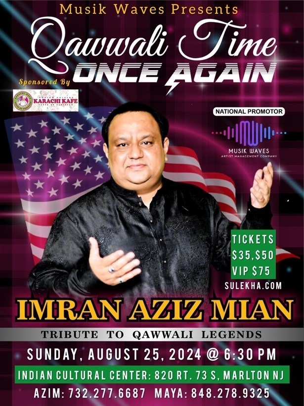 HomeEventsQawwali Time with Imran Aziz Mian This Event has Passed Qawwali Time with Imran Aziz Mian Sunday, August 25, 2024 6:30 PM - 11:00 PM 6:30 PM - 11:00 PM See all dates and Times Indian Cultural Center of South Jersey Parking Deals Get a Ride LYFT UBER Add to Calendar 08/25/2024 06:30 PM 08/25/2024 11:00 PM America/Atikokan Qawwali Time with Imran Aziz Mian Qawwali Time with Imran Aziz Mian Event LinksTickets: https://go.evvnt.com/2530381-0 Details & Tickets: https://www.upcomingevents.com/south-jersey/events/indian-cultural-center-of-south-jersey/qawwali-time-with-imran-aziz-mian-266668?ref=uceaddevent Indian Cultural Center of South Jersey, 820 New Jersey 73, Evesham, NJ, 08053 Set Reminder Categories Live Performance, Performing Arts Qawwali Time with Imran Aziz Mian Event LinksTickets: https://go.evvnt.com/2530381-0