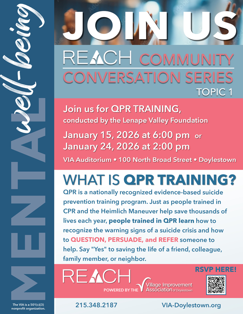 Join the Reach Community Conversation series, sponsored by the Village Improvement Association of Doylestown, for vital QPR training, conducted by the Lenape Valley Foundation. This nationally recognized, evidence–based program teaches you the critical skills to recognize the warning signs of a suicide crisis, and how to Question, Persuade and Refer someone to help. Just like CPR, CPR training can help save a life in your community, family or neighborhood.