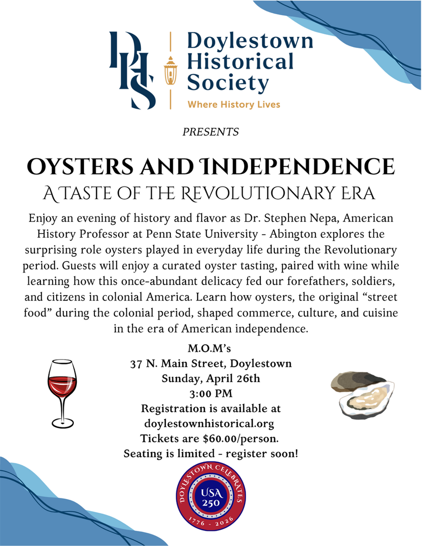 Guests will enjoy a curated oyster tasting paired with wine. The event will feature Dr. Stephen Nepa, American History Professor at Penn State University - Abington, who will explore the surprising role oysters played in everyday life during the Revolutionary period. Attendees will learn how this once-abundant delicacy fed colonial forefathers, soldiers, and citizens. Dr. Nepa will also discuss how oysters, the original "street food" of the colonial period, shaped commerce, culture, and cuisine in the era of American independence.