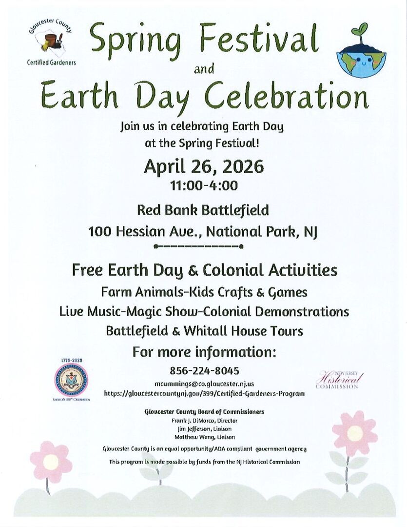 Sunday April 26, 2026 from 11:00am-4:00pm Join us in celebrating Earth Day at the Spring Festival! Free Earth Day Exhibits/Presentations & Colonial Craft demonstrations/activities- Glass making, Pottery, Hearth Cooking, Spinning/Weaving; Farm Animals; Kids Crafts & Games; Live Music; Craft vendors; Food Trucks; Magic Show; Battlefield Tours & Whitall House Tours.