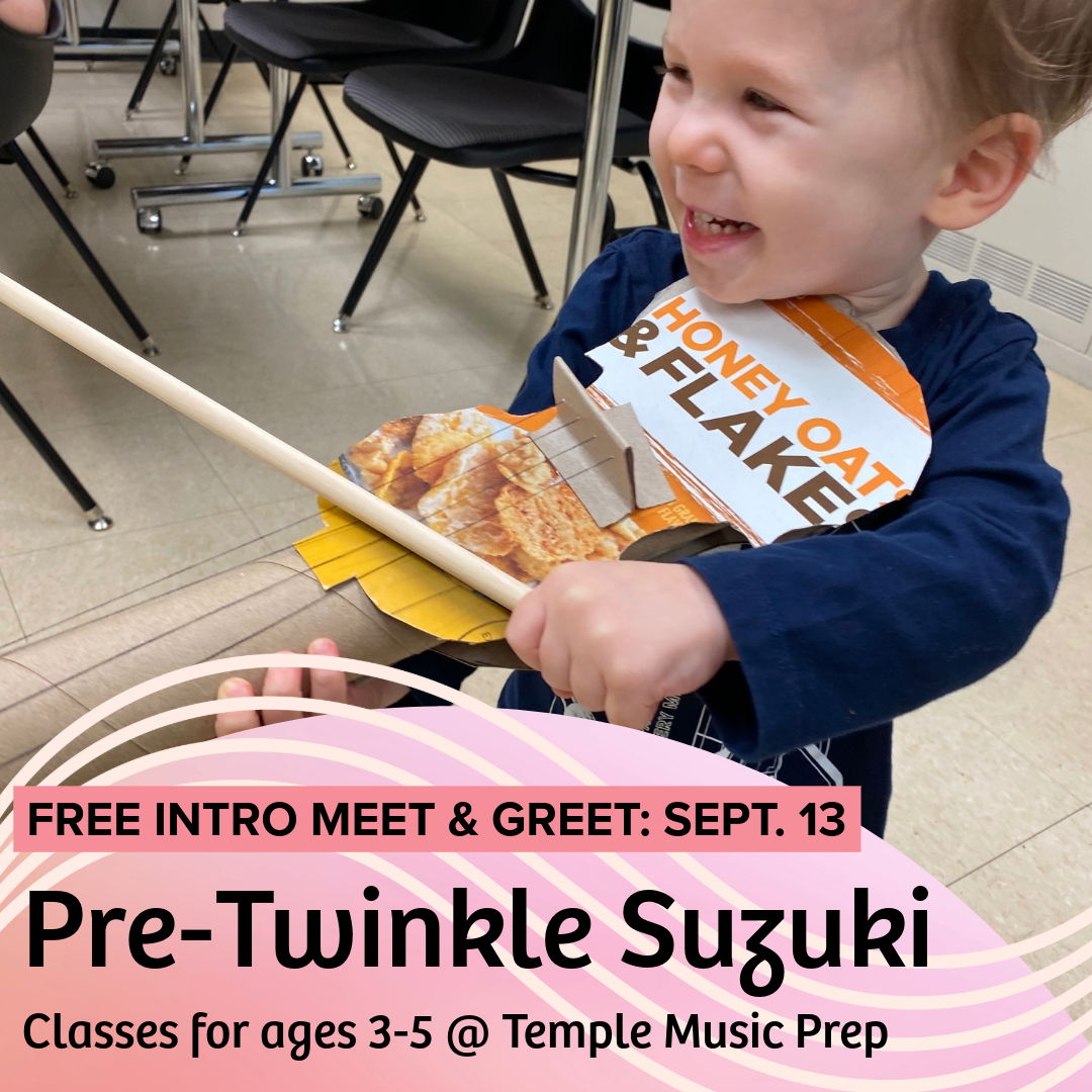 Pre-Twinkle Classes provide opportunities for very young children to develop basic musicianship and readiness skills for success in the Suzuki approach. A core component of Pre-Twinkle classes at Temple Music Prep is Suzuki POP (Paper Orchestra Program). Students will build a guitar and violin/viola out of everyday household items, sing, and move with their instruments. Students will have a variety of musical enrichment activities that mix arts and crafts with music. Students will do drills to start establishing a set of guitar and violin/viola performing skills. Students will learn instrument and bow parts plus the famous “Twinkle Variations” on their Paper guitar and violin/viola. At the end of the session, students will present a short performance to show off their instrument. The Free Intro starts at 10:30am, and all are welcome to attend the Pre-Twinkle Suzuki recital prior to the intro at 9:30am.