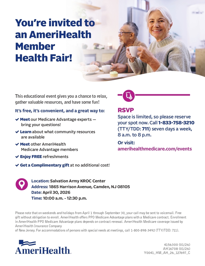 AmeriHealth will host its second annual Medicare Advantage Member Health Fair. Seniors from Camden and surrounding communities who are AmeriHealth Medicare Advantage members are invited to attend the event, which aims to improve their access to preventative care and address health disparities.