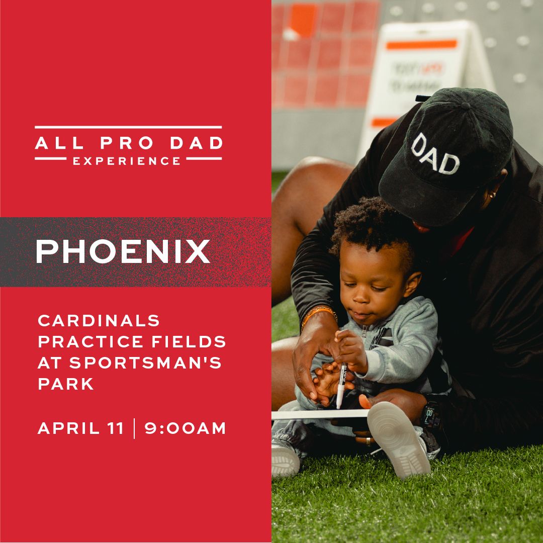 It starts when you and your child experience the thrill of stepping onto the field where your Arizona Cardinals Practice. You’ll spend the next few hours connecting with your kids – with plenty of fun and games plus some practical fatherhood tips you can take home and put into practice. You won’t want to miss this memorable Phoenix All Pro Dad Experience, created just for you and your kids.