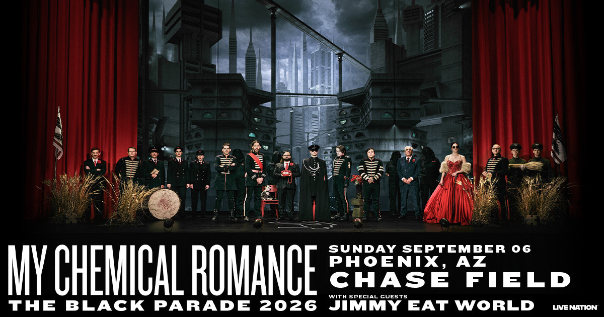 HomeEventsMy Chemical Romance: The Black Parade 2026 My Chemical Romance: The Black Parade 2026 Sunday, September 06, 2026 7:00 PM - 9:00 PM 7:00 PM - 9:00 PM See all dates and Times Chase Field Parking Deals Get a Ride LYFT UBER Add to Calendar 09/06/2026 07:00 PM 09/06/2026 09:00 PM America/Boise My Chemical Romance: The Black Parade 2026 My Chemical Romance The Black Parade 2026 with Jimmy Eat World @ Chase Field on September 6.Event LinksTickets: https://go.evvnt.com/3482924-0 Details & Tickets: https://www.upcomingevents.com/phoenix/events/chase-field/my-chemical-romance-the-black-parade-2026-602549?ref=uceaddevent Chase Field, 401 East Jefferson Street, Phoenix, AZ, 85004 Set Reminder Categories Concert, Live Performance My Chemical Romance The Black Parade 2026 with Jimmy Eat World @ Chase Field on September 6.Event LinksTickets: https://go.evvnt.com/3482924-0