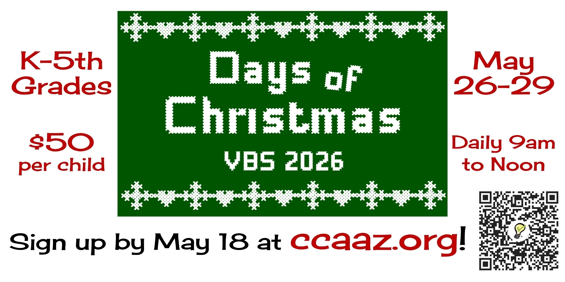 Start your summer on a cool note with the CCA "Days of Christmas" Vacation Bible School! 9am to Noon daily, K-5th grades, $50/child, sign up by May 18 at ccaaz.org/vbs!