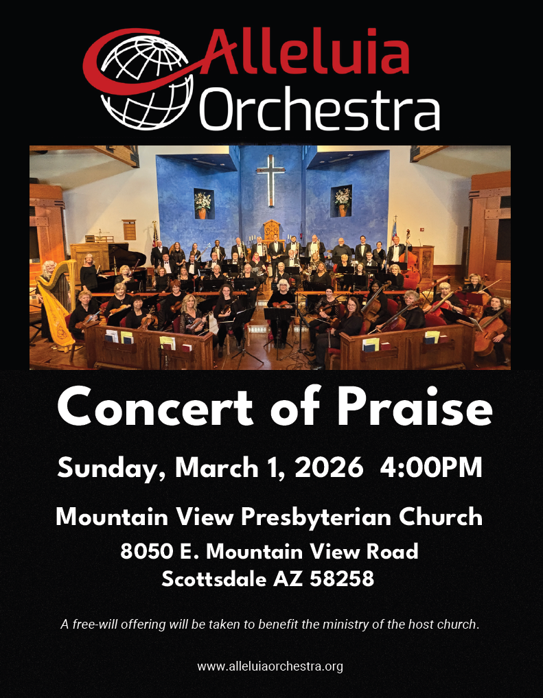 Join Alleluia Orchestra for their free Concert of Hope at Mountain View Presbyterian Church in Scottsdale, AZ on Sunday March 1, 2026 at 4:00pm. Featuring composer Grace Aarons playing her new composition, Piano Concerto in A, Movement 1, Andante, inspired by Job 38:4-8: "I laid the foundation of the earth...When the morning stars sang together and the sons of God shouted for joy." A free will offering will be collected for Community House AZ, to further their mission of providing community, dignity and hope to the homeless. For more information, visit Alleluia Orchestra online at www.alleluiaorchestra.org. Come be filled with worship and hope!