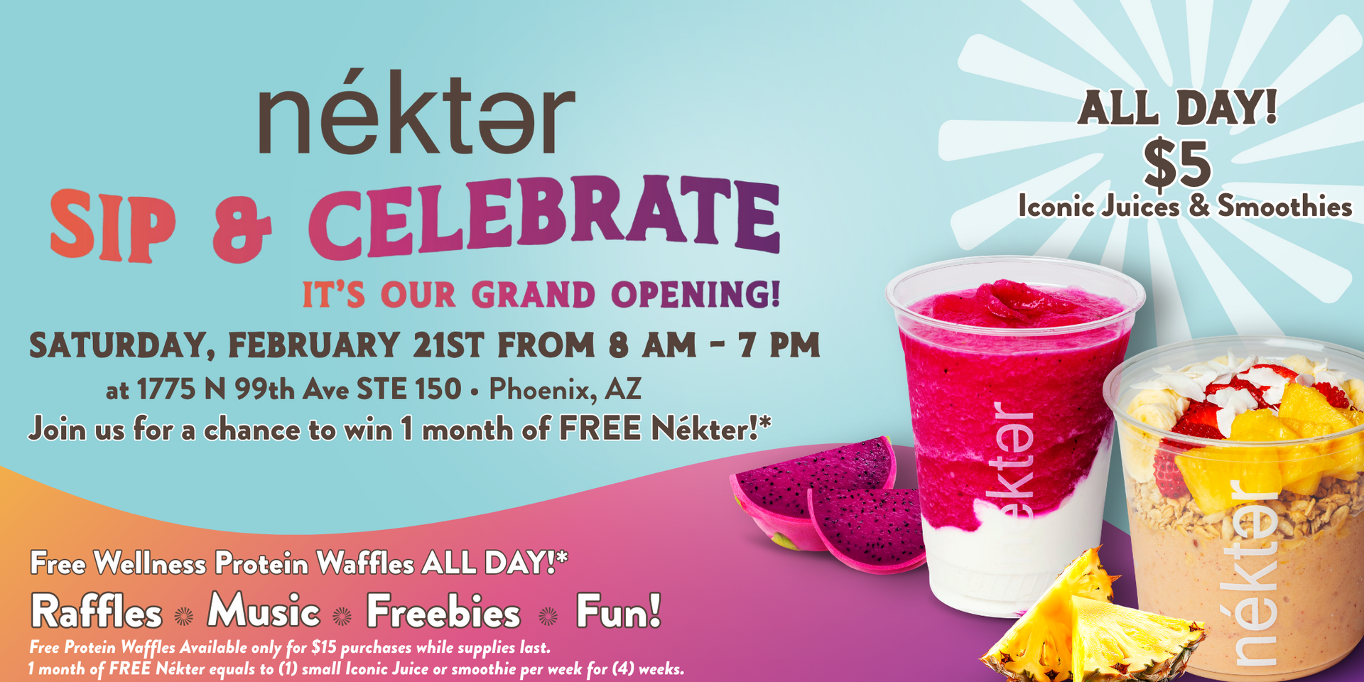*Free Month of Nékter raffle winners receive one small smoothie per week for four consecutive weeks, redeemable only at the 99th Ave Phoenix location.