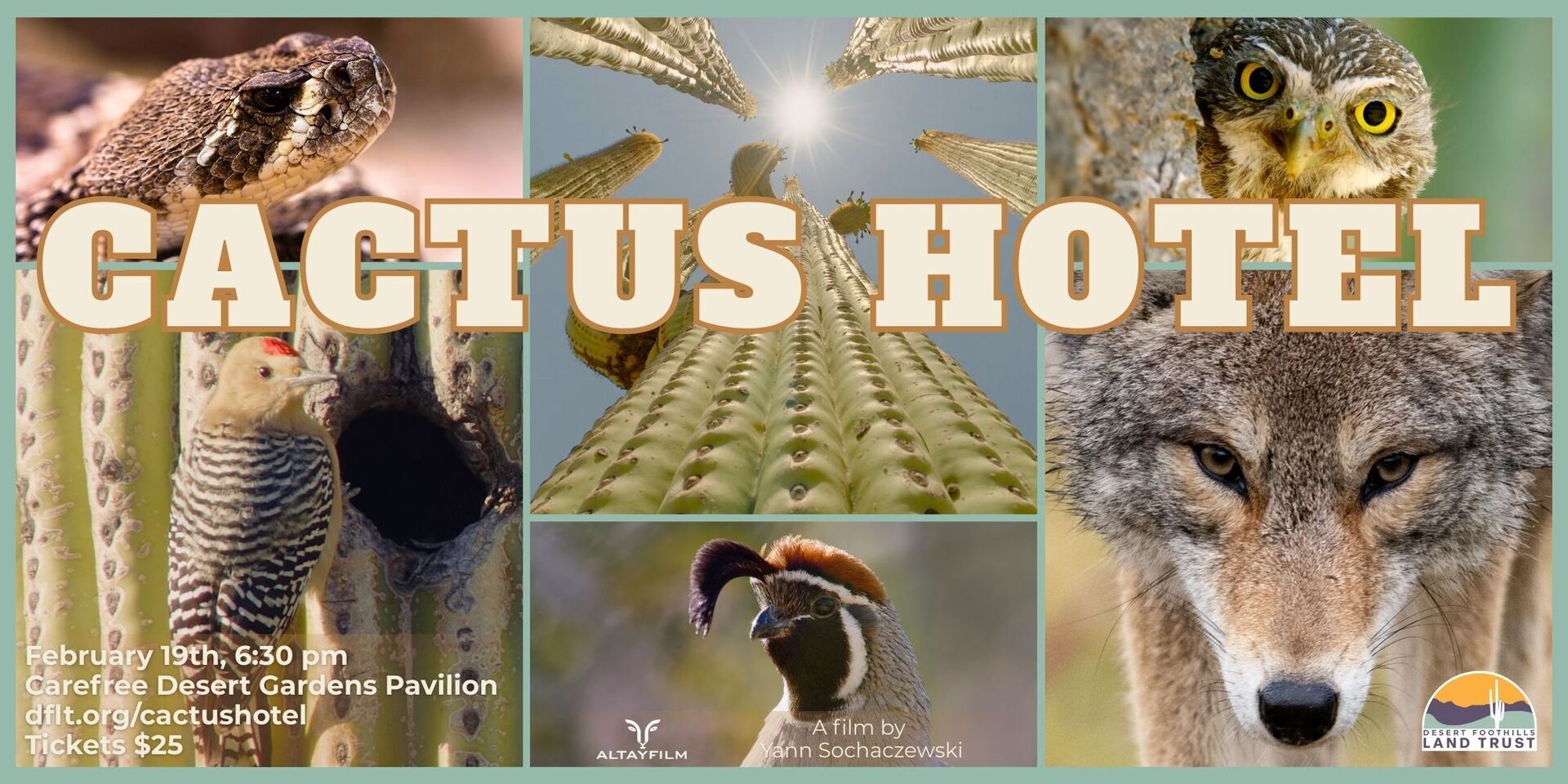 Join Desert Foothills Land Trust for a special outdoor screening of "Cactus Hotel" under the desert stars. Inspired by the beloved children's book "Welcome to the Cactus Hotel," the film follows the life of one towering saguaro and the community of desert creatures who depend on it. Watch as Gila woodpeckers carve out nesting holes, elf owls move into vacant rooms, and countless other species find food and shelter in this prickly high-rise. With daily "check-ins" and "check-outs," the cactus becomes a hub of desert life—part apartment building, part restaurant, part refuge.