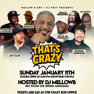 HomeEventsThat's Crazy! That's Crazy! Sunday, January 11, 2026 7:00 PM - 8:30 PM 7:00 PM - 8:30 PM See all dates and Times Stir Crazy Comedy Club Parking Deals Get a Ride LYFT UBER Add to Calendar 01/11/2026 07:00 PM 01/11/2026 08:30 PM America/Boise That's Crazy! That's Crazy! Event LinksTickets: https://go.evvnt.com/3408481-0 Details & Tickets: https://www.upcomingevents.com/phoenix/events/stir-crazy-comedy-club/thats-crazy-580284?ref=uceaddevent Stir Crazy Comedy Club, 6751 North Sunset Boulevard, Glendale, AZ, 85305 Set Reminder Categories Comedy, Comedy Show, Live Entertainment, Performing Arts That's Crazy! Event LinksTickets: https://go.evvnt.com/3408481-0